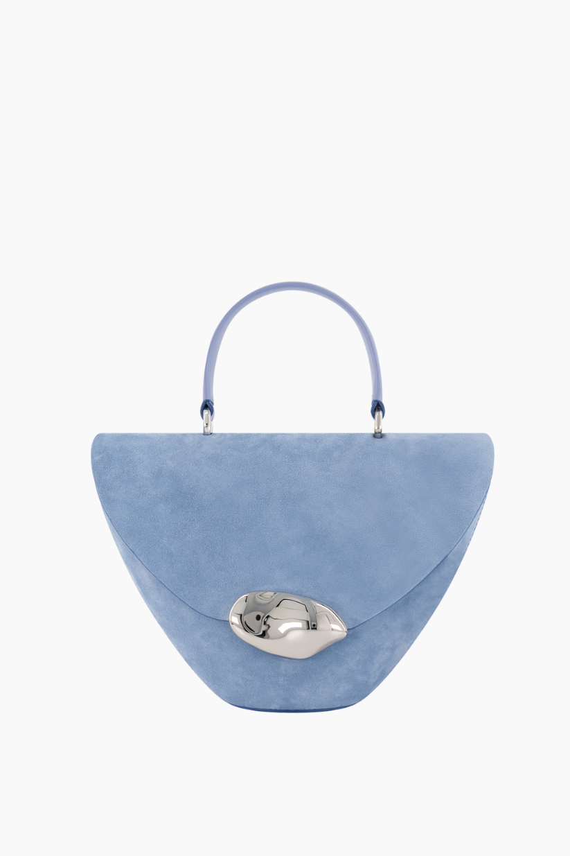 Small suede handbag featuring circular base, curved body, and rounded top flap. Top handle and removable crossbody strap. Sculptural, hand-carved palladium closure.