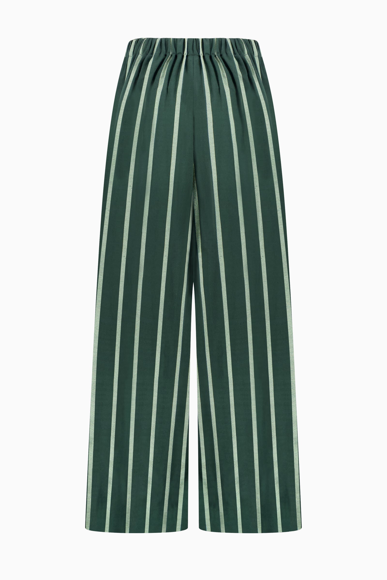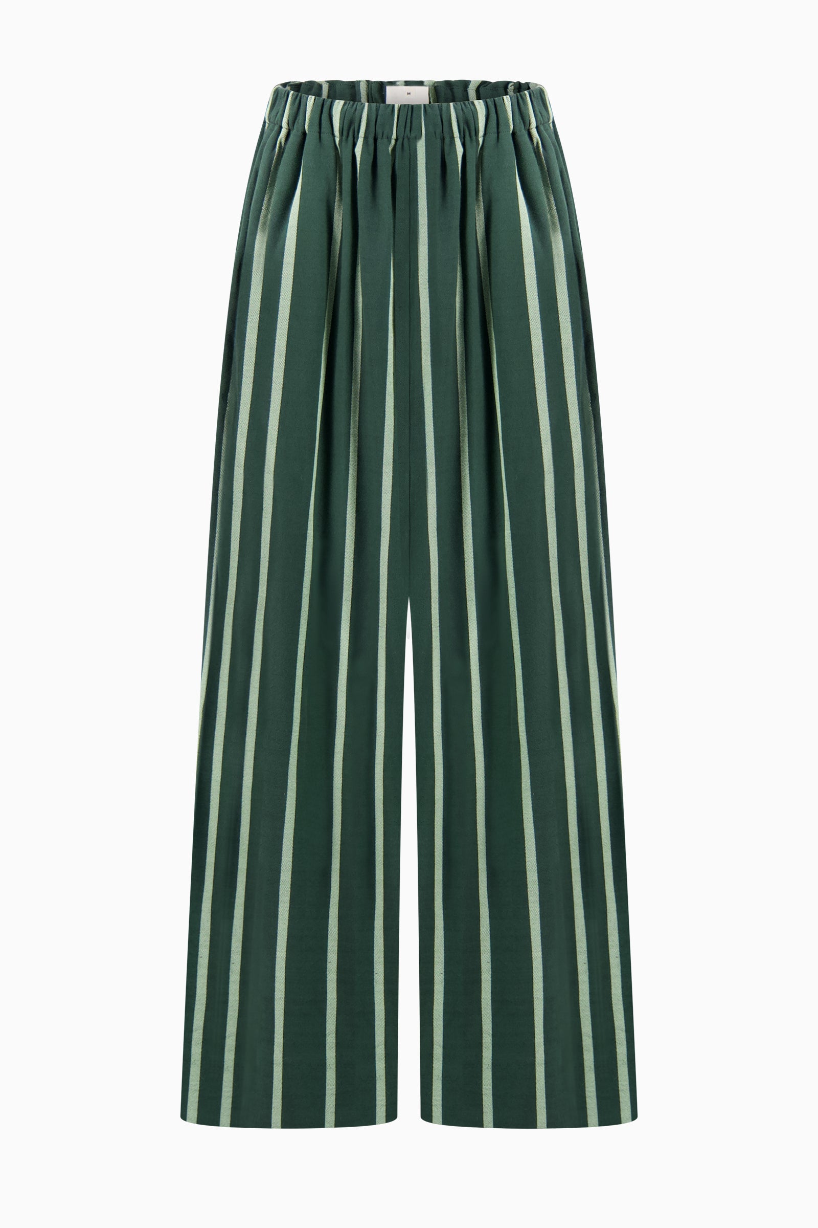 Relaxed pant in handwoven cotton. Designed with an elastic waistband, wide leg, and full length. Lightweight with natural texture and movement.