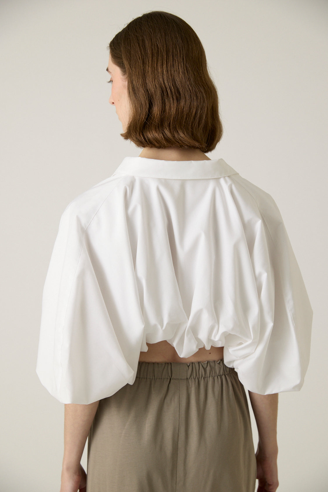 Shirt with bubble hem and exaggerated puff sleeves. Button front closure. Spread collar. Elbow-length sleeves. Chest patch pocket.