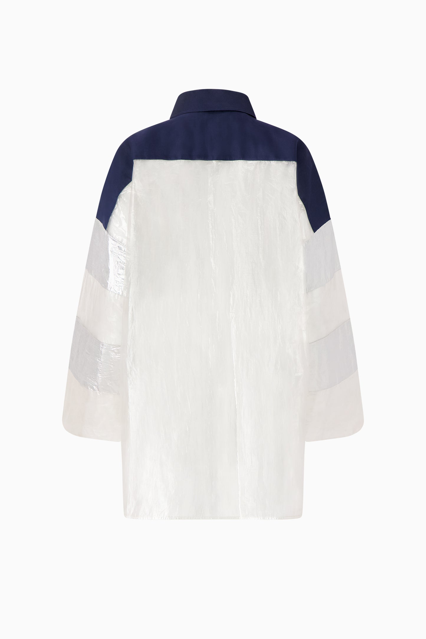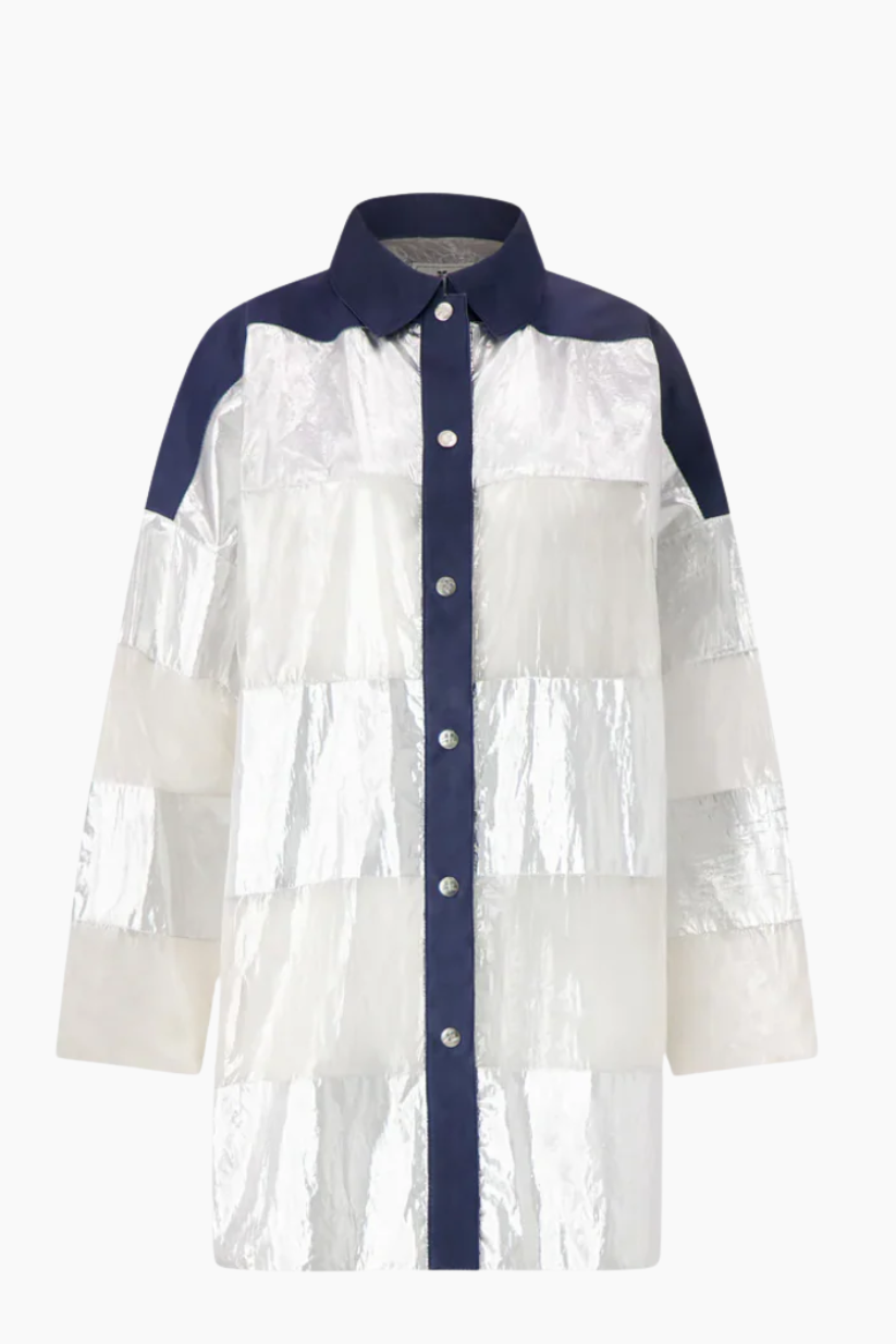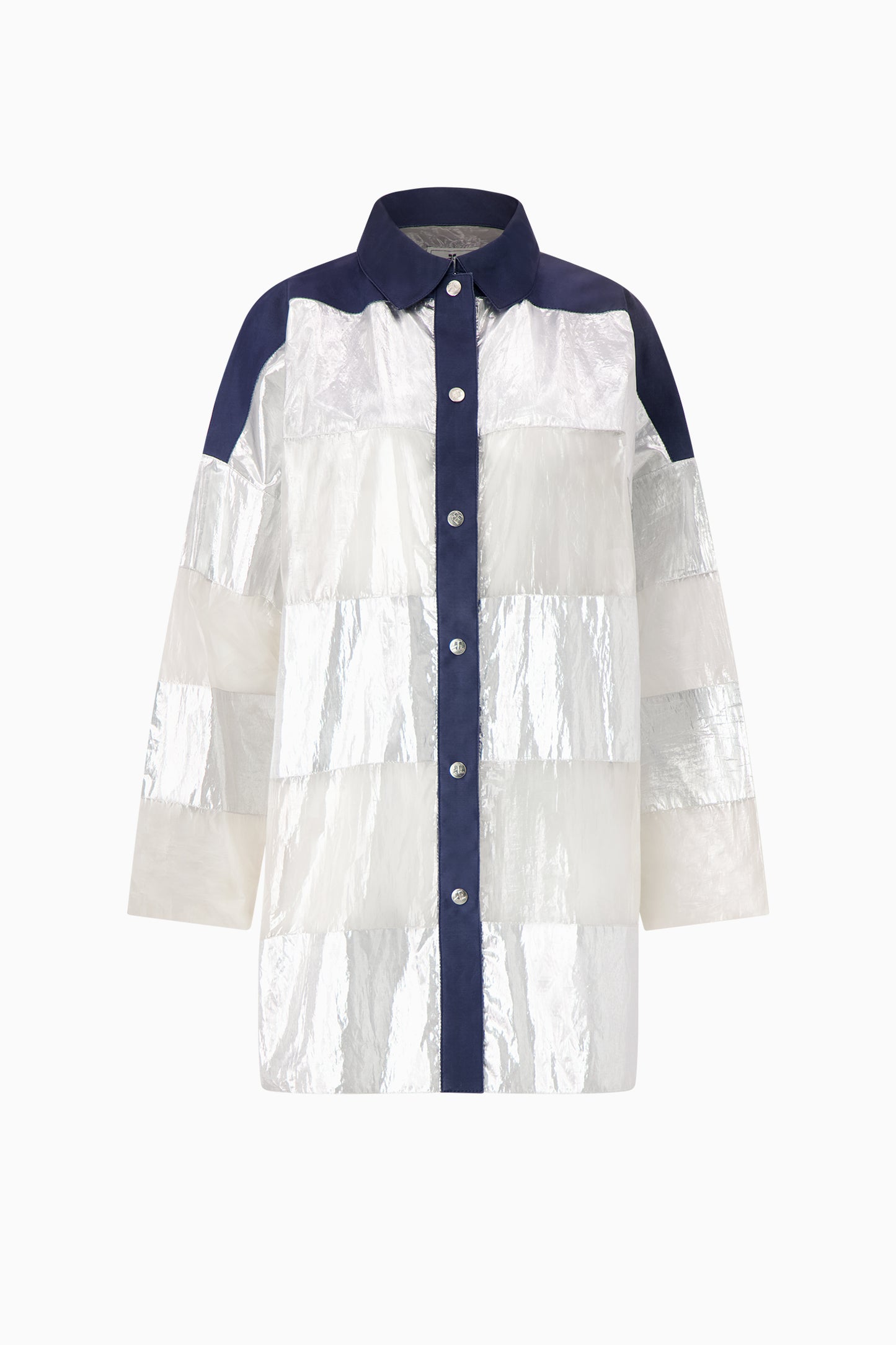 Oversize overshirt in transparent, navy and silver lamé fabric. Circa 1960.