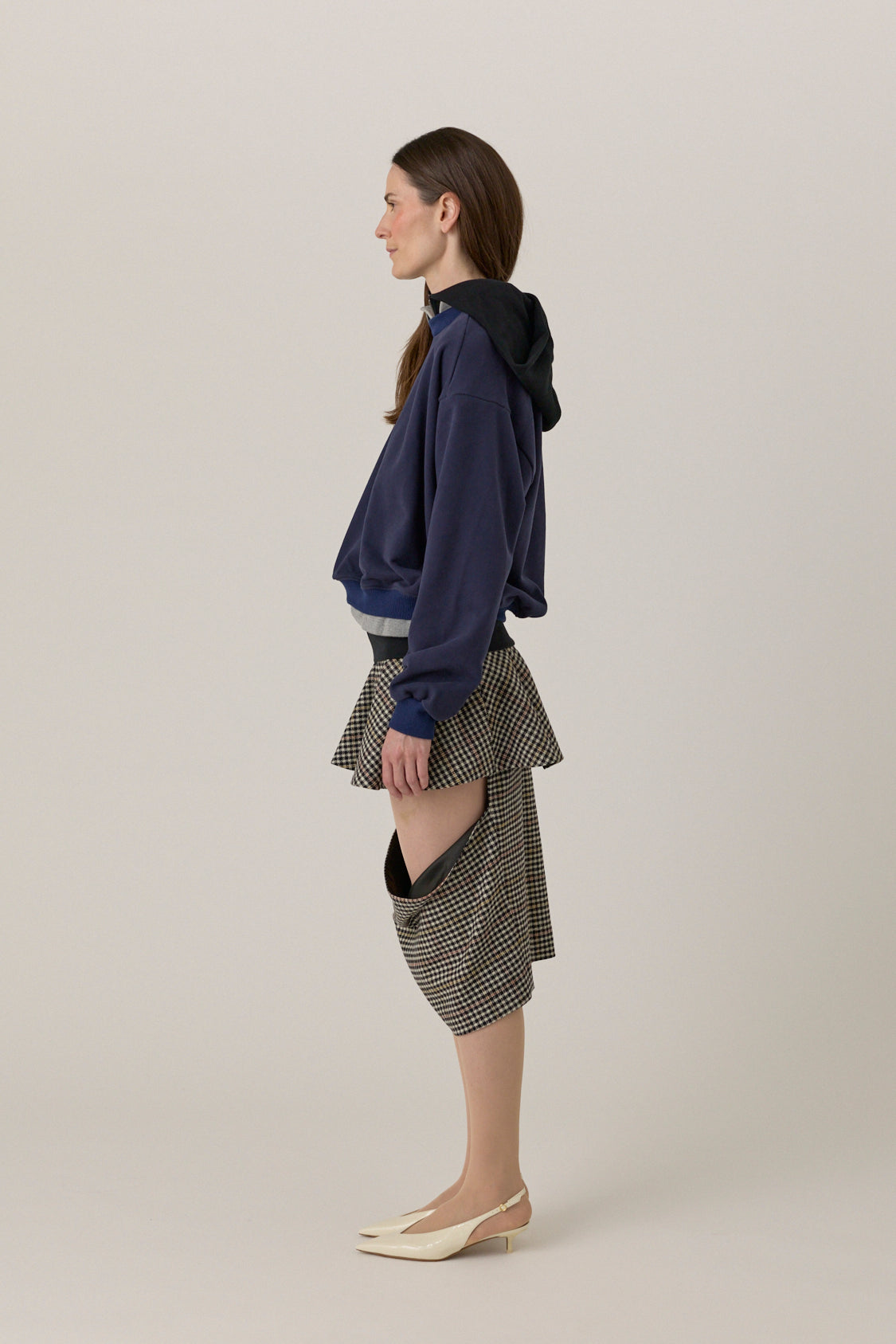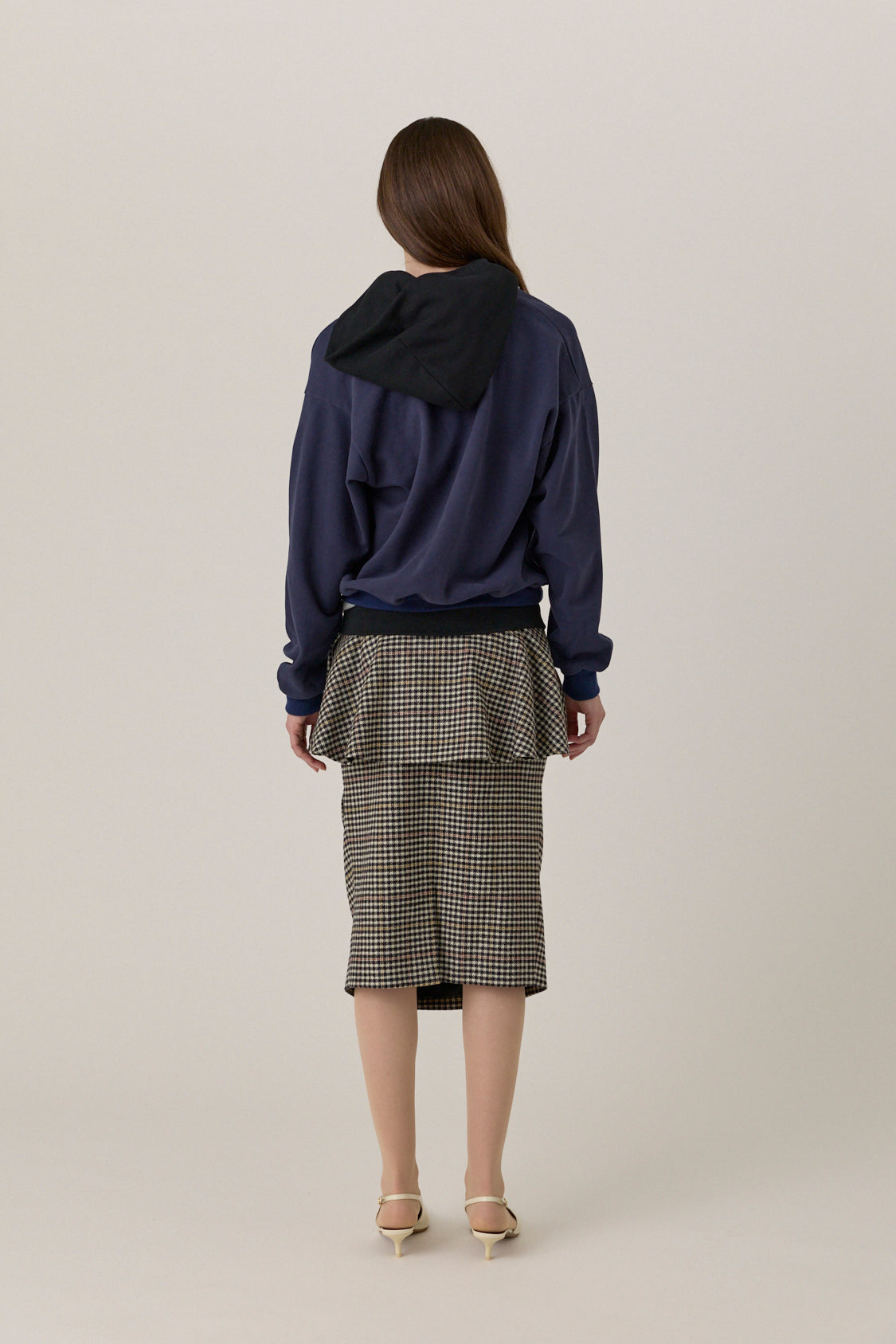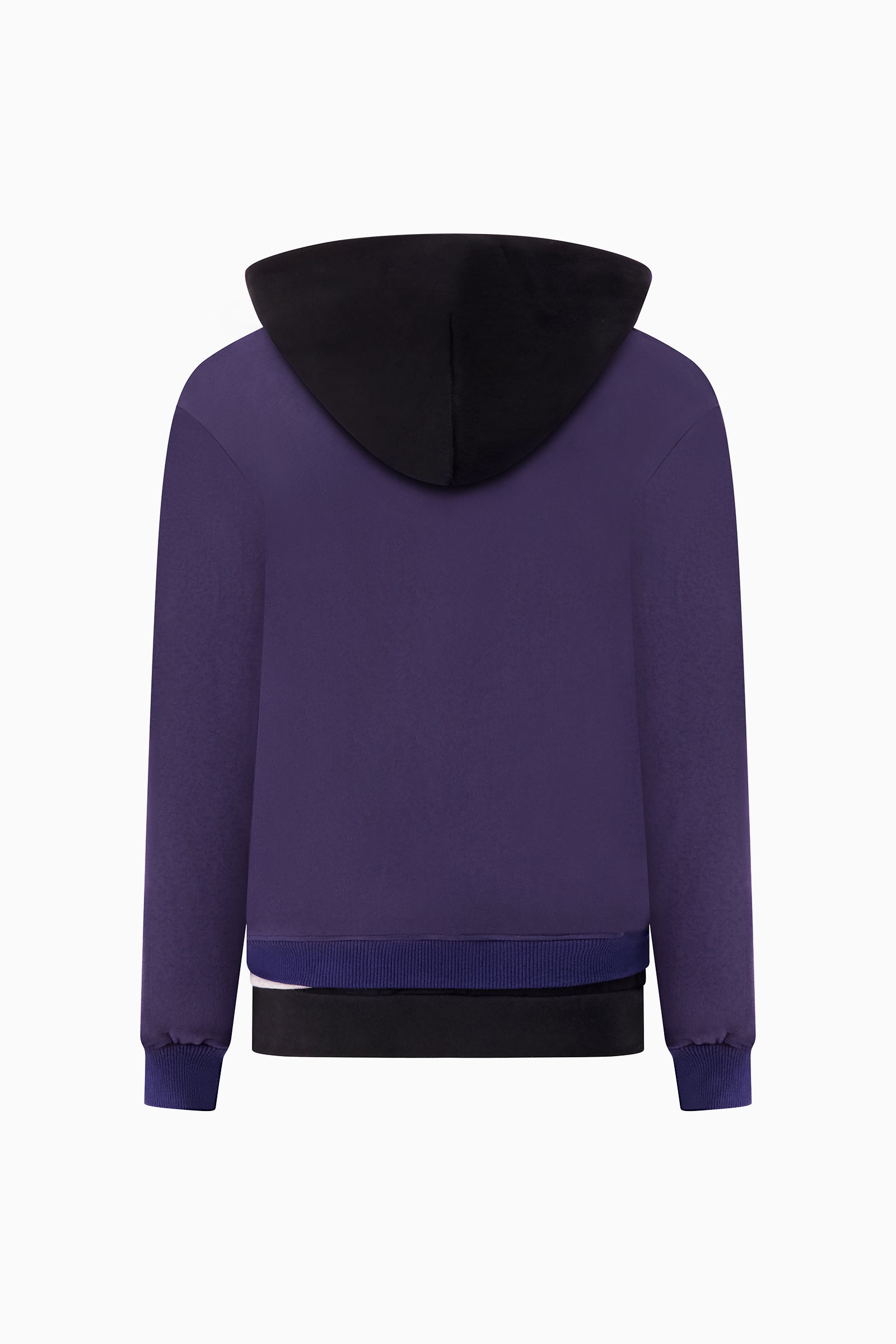 Triple-layered hoodie in navy, black, and grey. Features a relaxed fit with ribbed cuffs and hem, contrast hood, and layered hem detailing.
