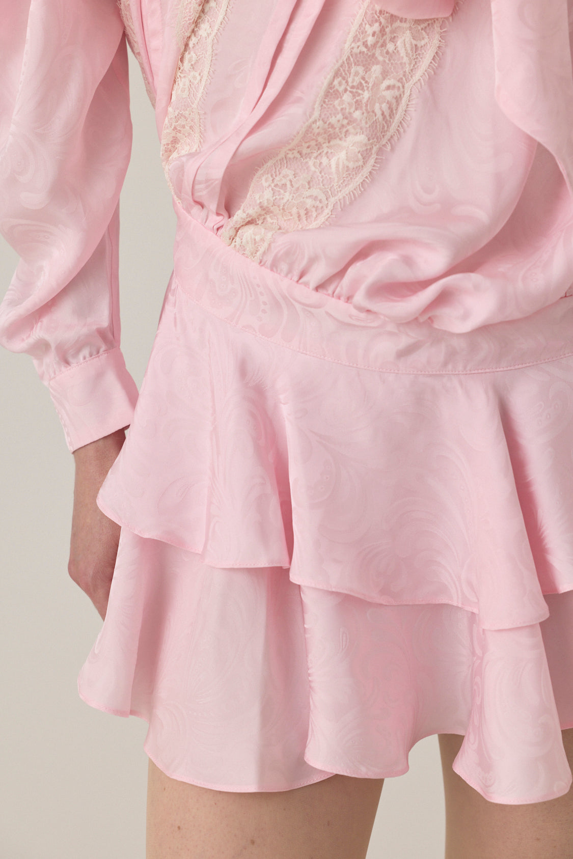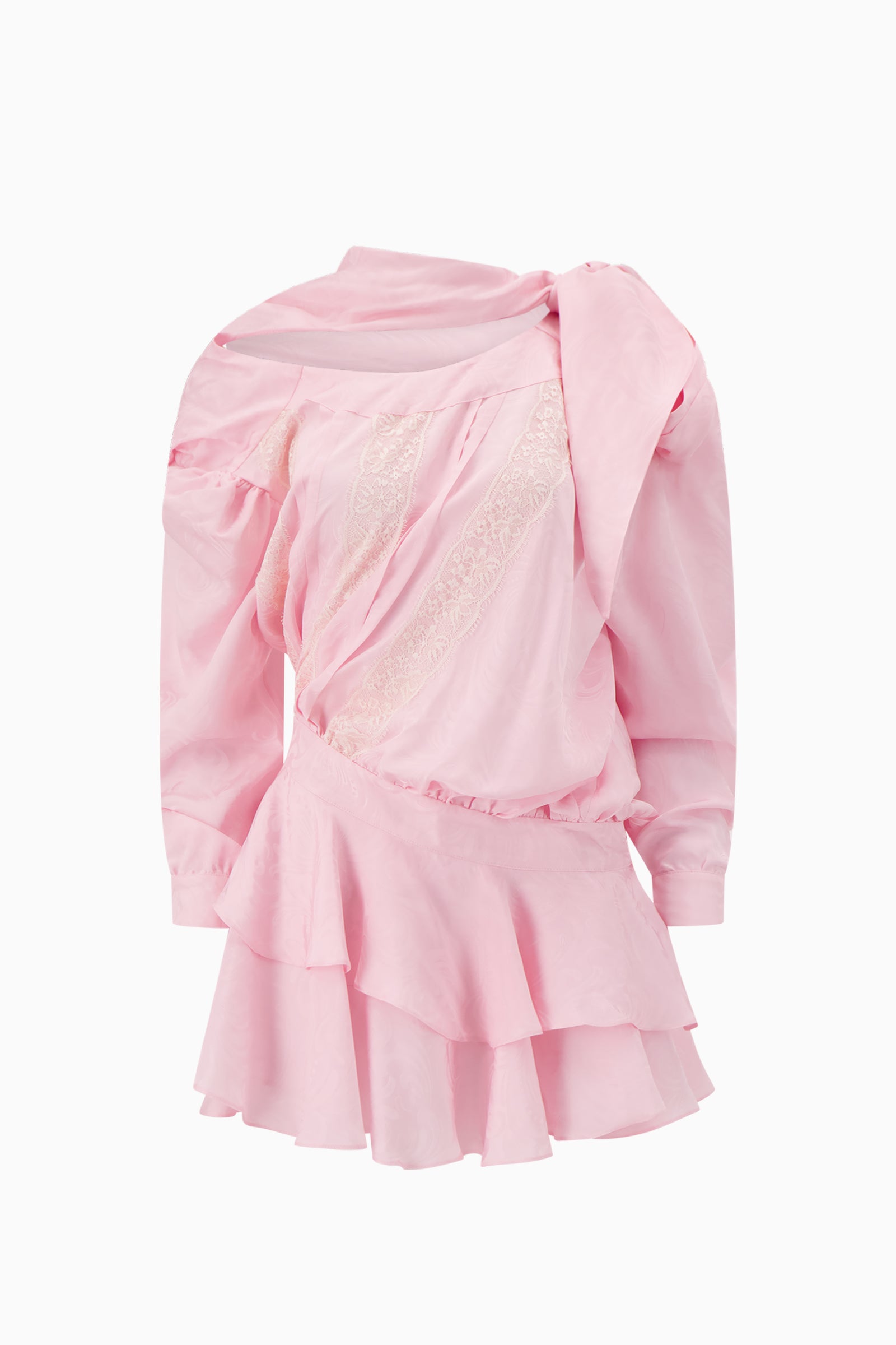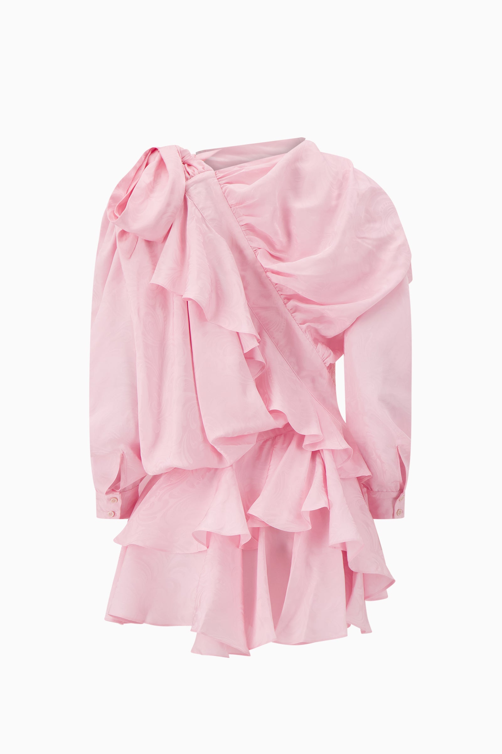 Mini dress jacquard fabrication with draped ruffle detailing and asymmetric construction. Features long sleeves, gathered panels, and layered skirt.