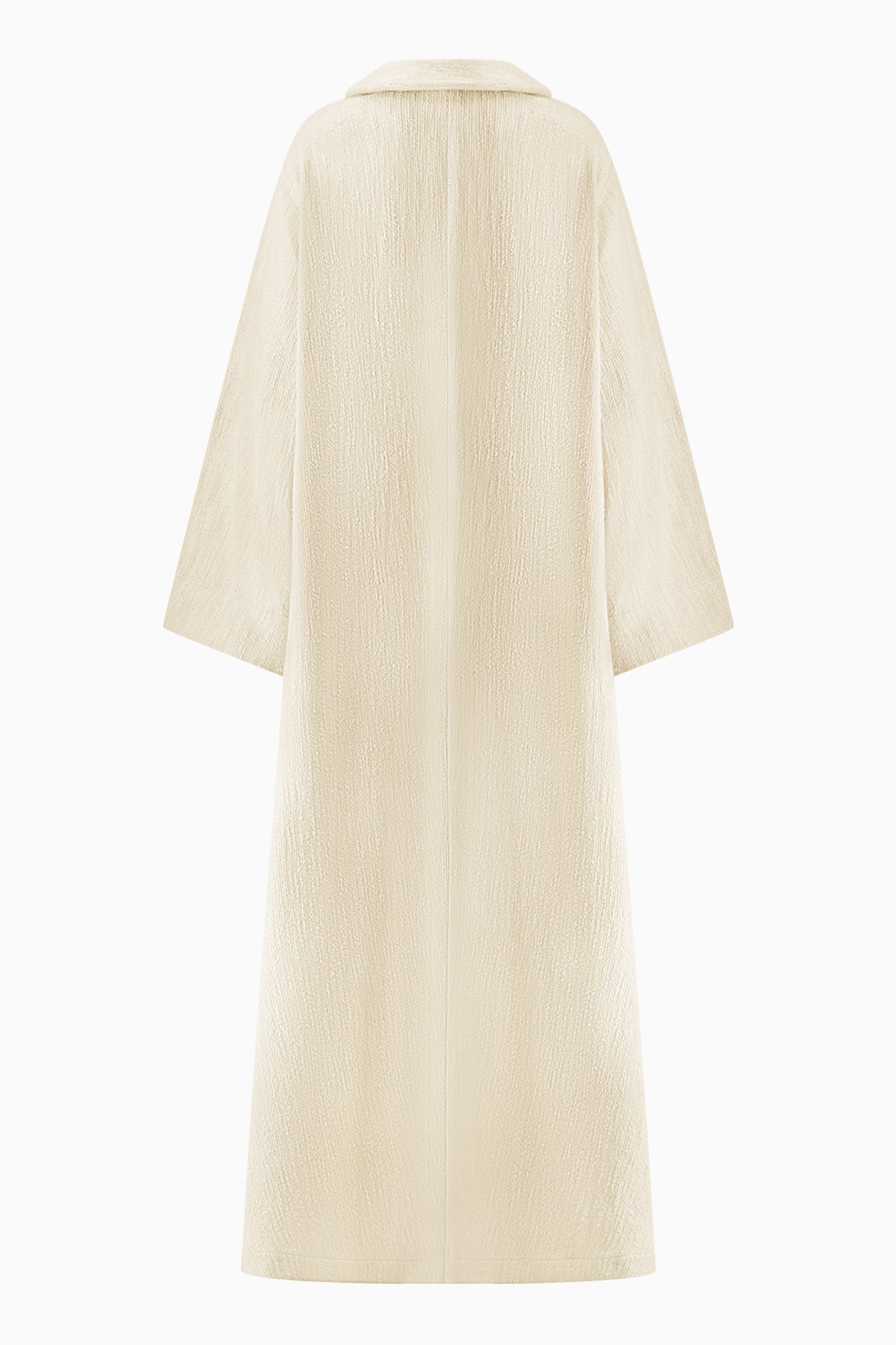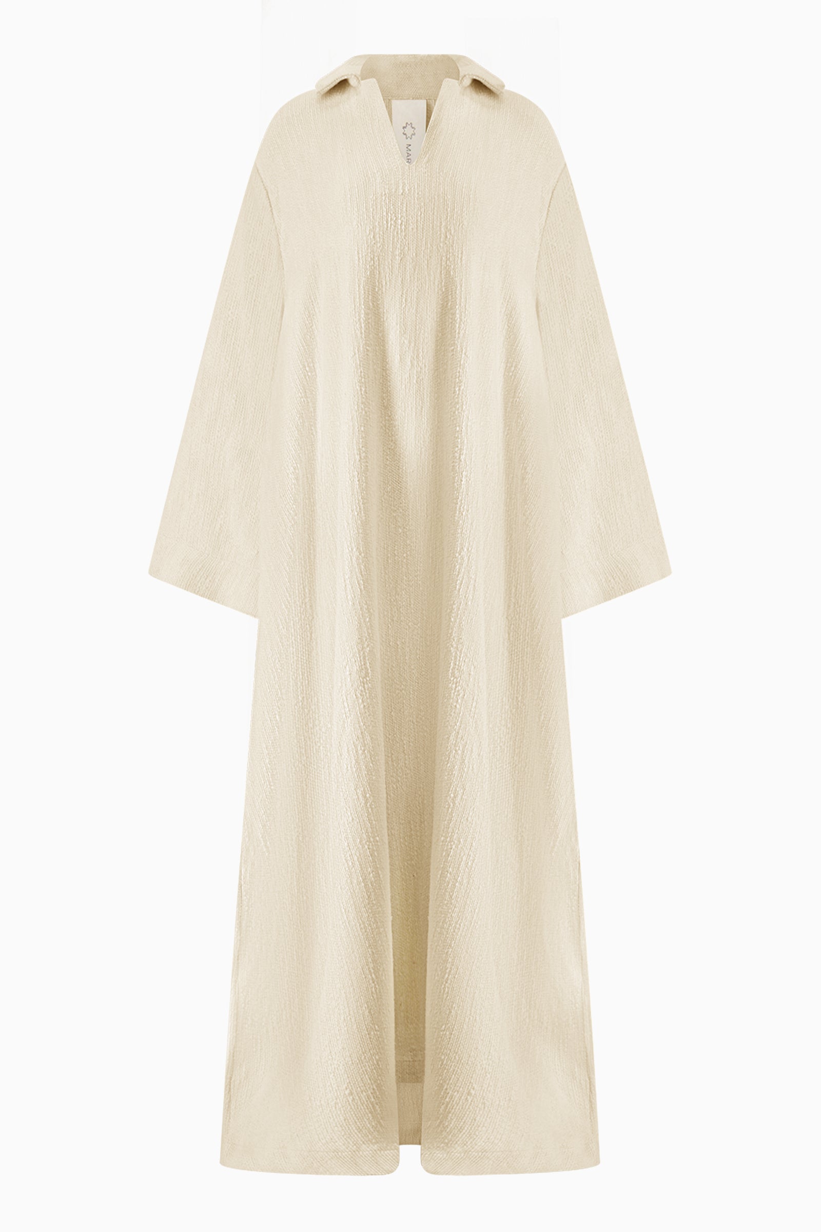 Textured caftan dress with relaxed, draped silhouette. Designed with wide sleeves, soft collar with subtle V-neck opening, and a full, easy shape.