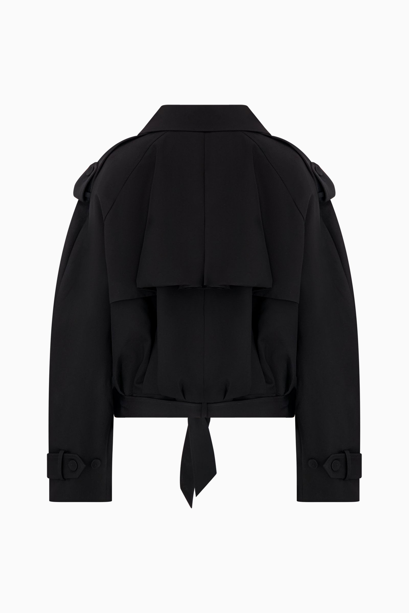 Black cropped wool jacket with point collar, tie waist, and buttoned cuffs. Features front welt pockets, shoulder epaulettes, and a back storm flap detail.