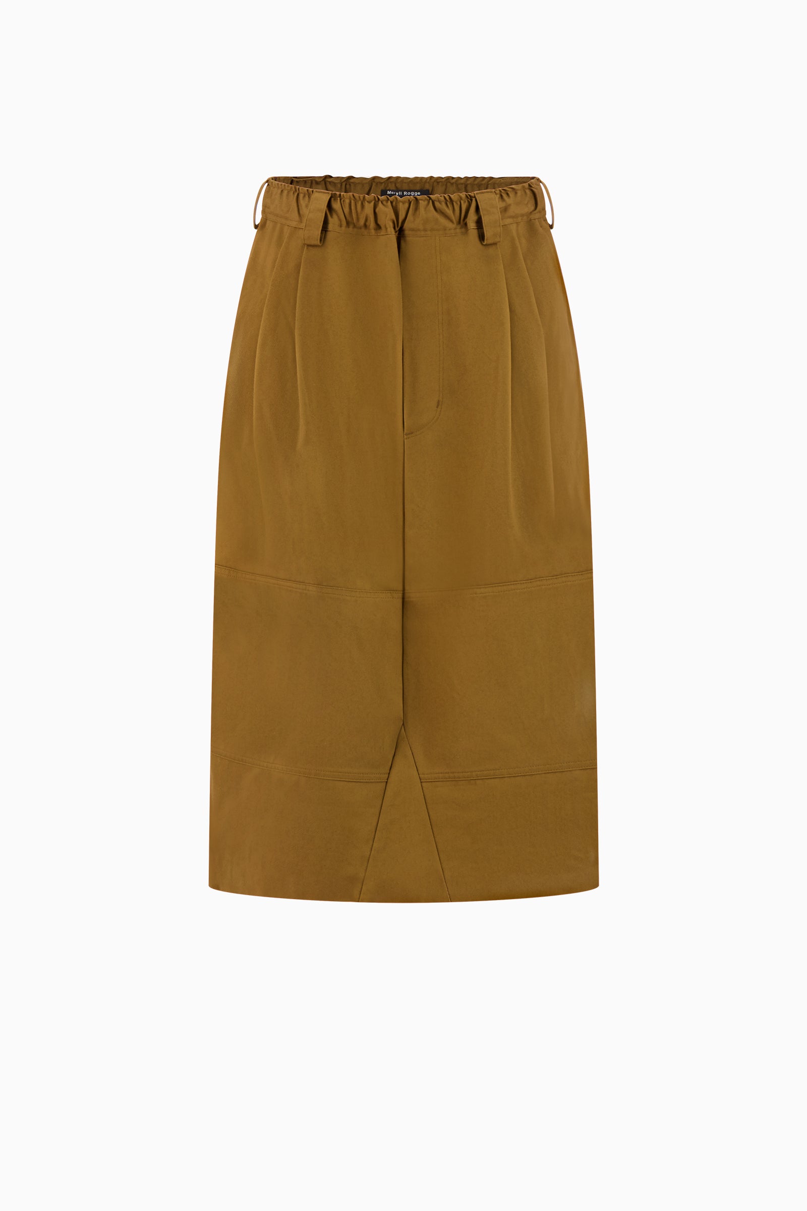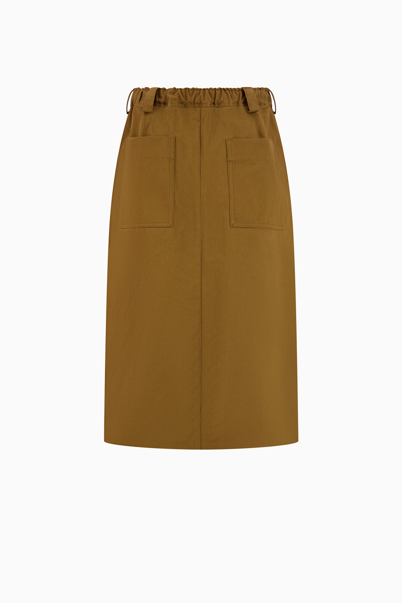 Mid-length skirt with a gathered elastic waistband. Designed with a straight fit, front seam detailing, and patch pockets at the back.