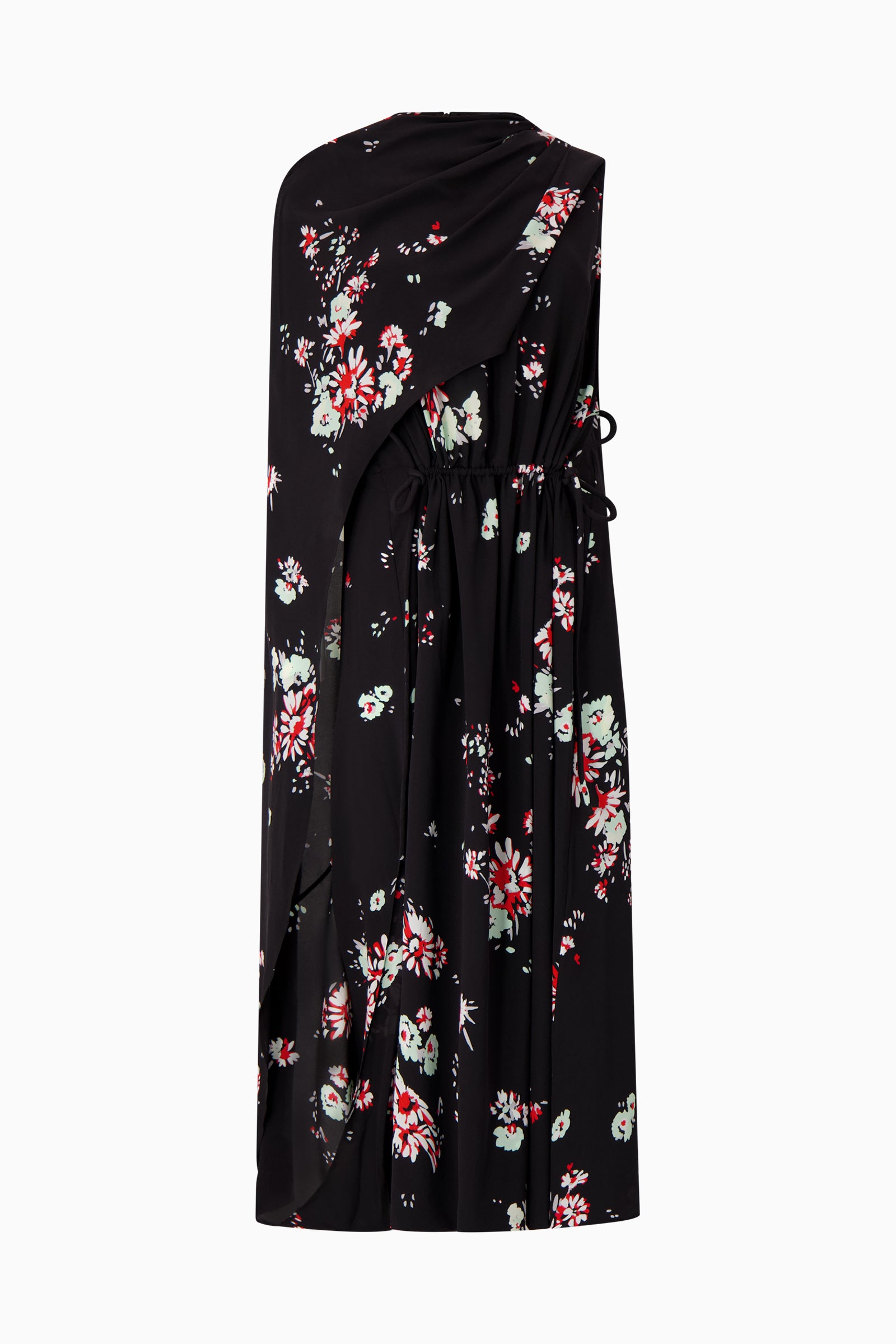 Dress featuring hand-painted floral print, crafted to an A-line silhouette with adjustable ruched waist and draped cape extension. Mock neckline. Cape extension. Ruched waist with self-tie knots. Side slit. A-line silhouette. Slim fit.